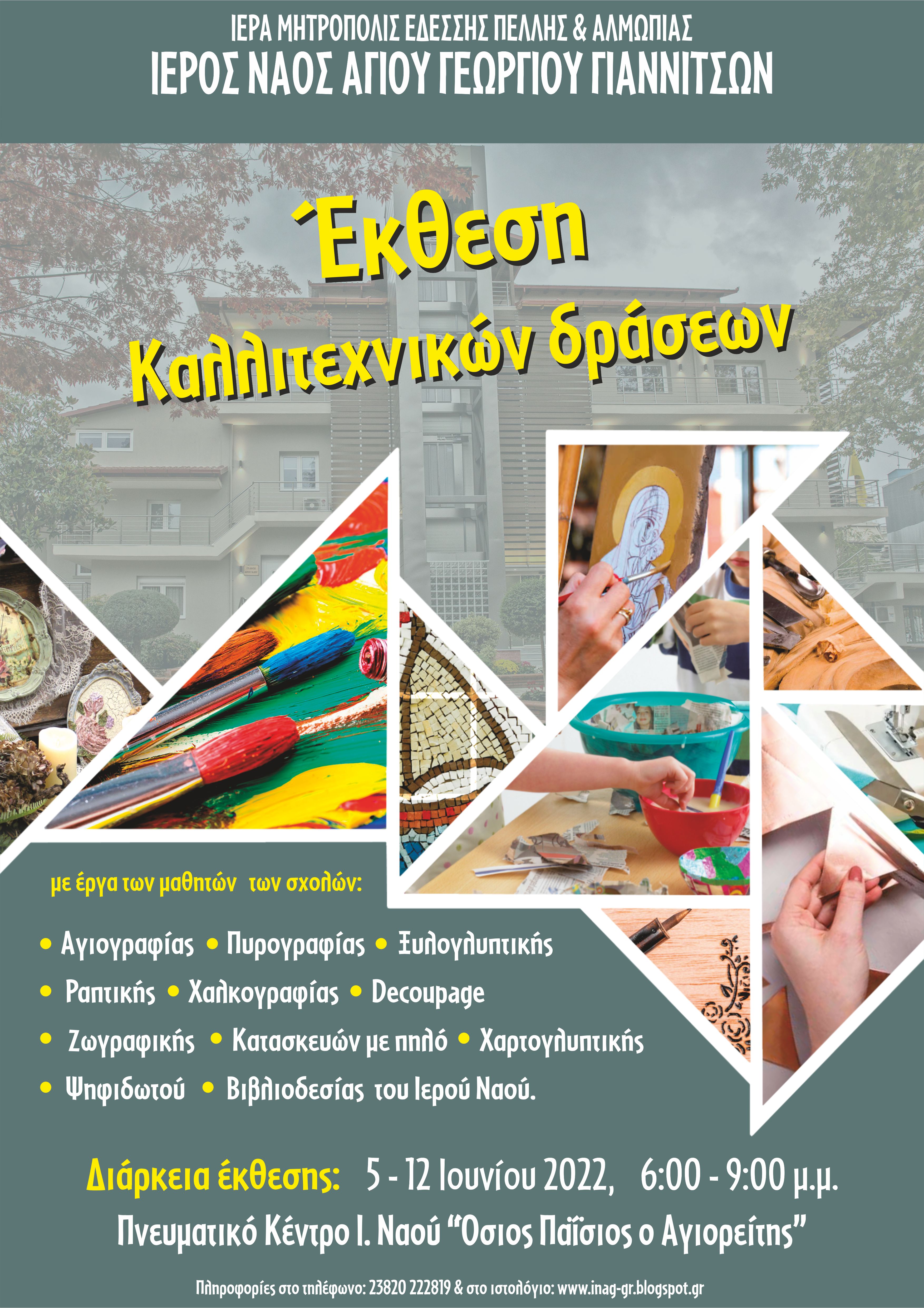 Την Κυριακή 5 Ιουνίου 2022, ξεκίνησε στο Πνευματικό Κέντρο "Όσιος Παΐσιος ο Αγιορείτης" η Έκθεση των Καλλιτεχνικών δράσεων της ενορίας Αγίου Γεωργίου Γιαννιτσών. Η έκθεση περιλαμβάνει έργα μαθητών που συμμετείχαν στα καλλιτεχνικά τμήματα της ενορίας.